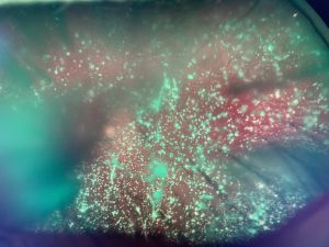 角膜周辺部の実質層にうっすらと白い混濁が顕微鏡で確認できますが(肉眼ではわかりません)、これがクロスリンキングの効果で繊維構造の架橋が増えているために起こる現症です。