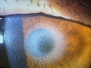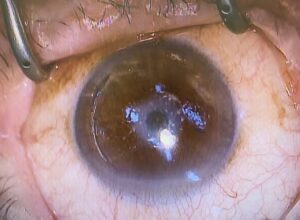 安全性高いとは言われていたものの、異物を挿入するため、定期的な検診と低濃度のステロイドの点眼が必要となる治療、ですが、通院する方も徐々に脱落し、点眼をしなくなったことによる影響もあるのか、通院されなくなって数年経ってから視力低下で受診、その時にインレー周辺に強い角膜混濁が生じてしまっていることがあります。